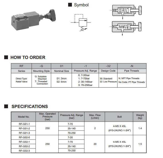 RF-G02 se utiliza para ajustar la presión máxima del circuito de pequeño flujo, o se utiliza como una válvula de seguridad. El montaje en placa y el montaje en línea están disponibles.