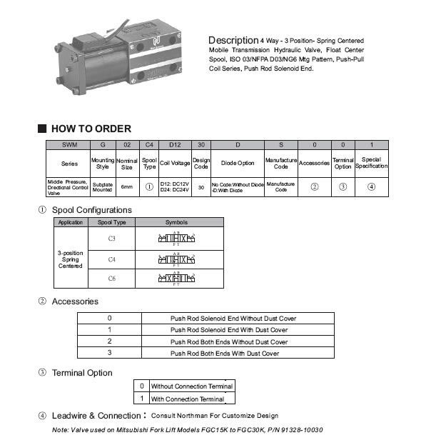 La válvula de control hidráulica de la carretilla elevadora SWM-G02 es ampliamente utilizada en las carretillas elevadoras, la máquina de la construcción, la máquina de la operación de la explotación minera, los vehículos de la construcción y la máquina agrícola. Este tipo de válvula direccional solenoide está especialmente desarrollado para la caja de cambios.