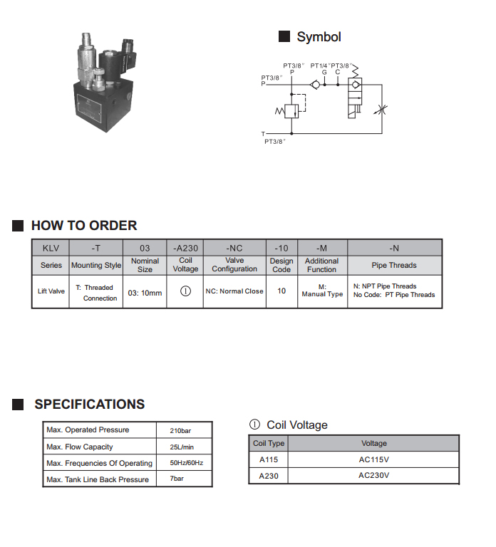 Modelo KLV La válvula hidráulica de la elevación es aplicable al sistema hidráulico de la sola-acción del solo-lazo, etc. Es ampliamente utilizado en los ascensores, las plataformas de elevación y el equipo de elevación de la logística. La válvula de control de elevación hidráulica es una válvula de combinación que contiene una válvula de regulación de presión tipo cartucho, una válvula de retención, una válvula de control de flujo y una válvula solenoide bidireccional de dos posiciones.