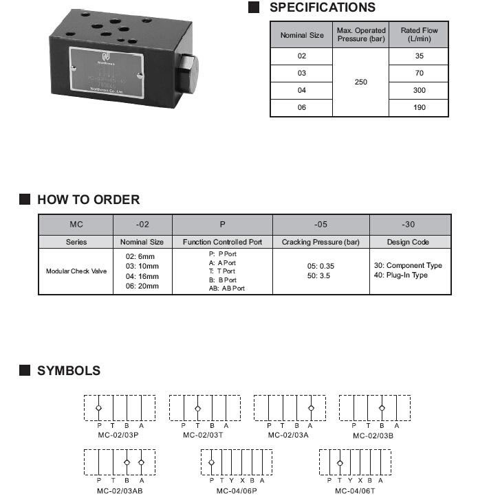 Los módulos de válvula unidireccionales se utilizan para permitir el flujo en una dirección y evitar el flujo en la otra. El diseño modular permite el apilamiento vertical con otros componentes del mismo tamaño. Los elementos de verificación se pueden construir en uno o dos puertos, siendo los otros puertos los orificios pasantes.