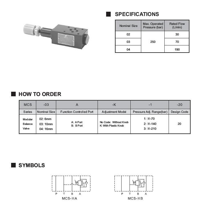 La válvula de contrapeso modular modelo MCS es una especie de válvula de control de presión de acción directa. Se puede aplicar a varios dispositivos hidráulicos que necesitan prevenir el peso muerto y la generación de contrapresión, y pueden prevenir con eficacia la vibración, el arrastre y el ruido generados durante la caída de los actuadores.