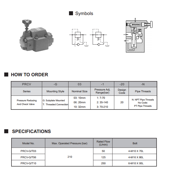 La válvula reductora de presión unidireccional modelo PRCV es una válvula de alivio de presión utilizada para ajustar la presión del circuito derivado inferior a la presión del circuito principal, que puede utilizar el puerto de control remoto para control remoto. La conexión paralela de la válvula reductora de presión al vástago de control contribuye a su función de descompresión unidireccional, permitiendo un flujo libre inverso desde el lado secundario al lado primario. El montaje en placa y el montaje en línea están disponibles.