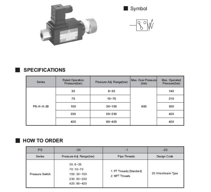 El interruptor de presión del émbolo está diseñado con una estructura tipo émbolo. Cuando la presión del aceite alcanza el valor de ajuste del resorte, el microinterruptor interno será presionado para generar una señal eléctrica "encendida o apagada", para controlar el enlace de otros componentes eléctricos en el sistema.