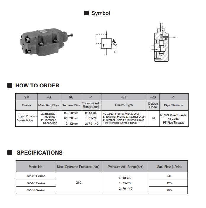 El modelo SV es un tipo de válvula de secuencia de actuación directa, incluyendo válvulas de secuencia, válvulas de descarga y válvulas de alivio de baja presión, que pueden ser accionadas mediante control de presión interno o externo. El montaje en placa y el montaje en línea están disponibles.